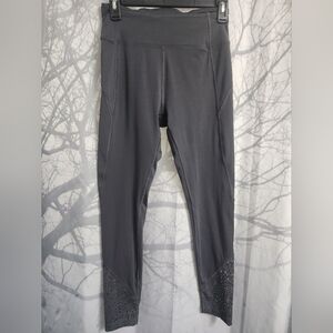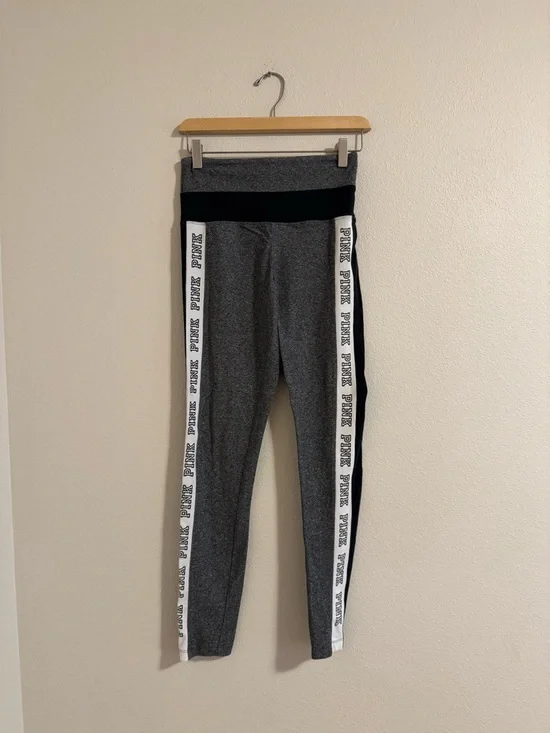 Athletic gray leggings by PINK Victoria's Secret. Features a wide black waistband for support. White side stripes with repeating PINK logo. Stretchy fabric for movement. Sleek, sporty look.