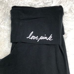 Size Small VS PINK Yoga Pants in black with a fold over waistband. No signs of wear and tear except a small bleach mark on bottom of the right pant leg by seam (photographed above). In great condition otherwise! Bundle with second pair of leggings or yoga pants for special deals! 💗💗💗