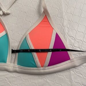 Victoria’s Secret PINK multicolor color block neon bikini. Medium bottoms, small top. Coral, purple, aqua. Top is a triangle padded halter style with a tie neck. Smoke free home