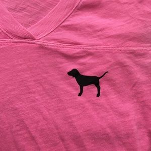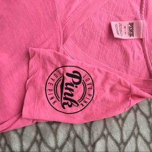 PINK campus short sleeve tee. very cute and flattering short sleeve with logo on chest and left sleeve. EUC only sign of wear is the fading at the armpits, but it is not noticeable when you wear it