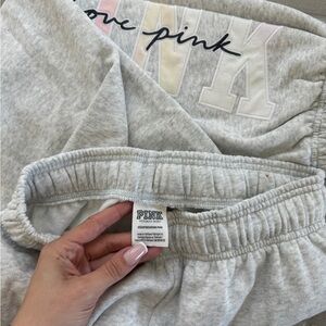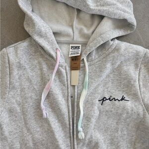 Victoria’s Secret PINK never worn matching sweatsuit. Pants are the baggy fleece campus sweatpant. Both pieces are a size extra small. UNWORN. Sweater still has tags attached. Light gray with ombre sunset tie-dye design. Zero flaws or damage. Pants have pockets. Relaxed fit.