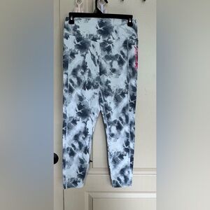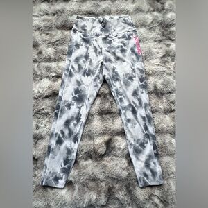 Victoria's Secret PINK white gray tiy-dry mid rise athletic leggings size medium Victoria's Secret Pink Ultimate athletic leggings allover white, gray black tie-dye print bright hot pink "pink" logo on left leg 2 side pockets