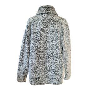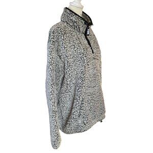 Women's Victoria's Secret PINK black and white sherpa quarter zip pullover soft jacket/sweater/sweatshirt. This has long sleeves, a high collar, kangaroo pocket, and a drawstring waist and collar. The size tag has been removed but I believe it's a large or XL - please see measurements below, and it also has the drawstring waist to tighten or loosen as needed. Excellent condition and from a smoke free pet free home. Quick shipper!