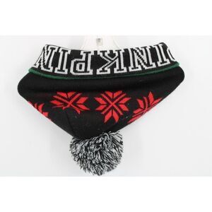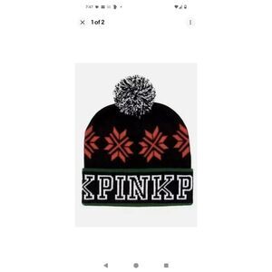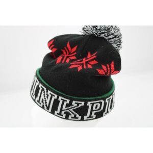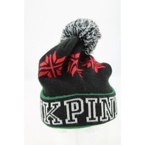 This is a Victoria's Secret PINK Beanie Hat with a knitted design, featuring a pompom on top. It is a limited edition winter accessory perfect for women. The color is black and it is one size fits all, making it a stylish and cozy choice for the cold weather season.