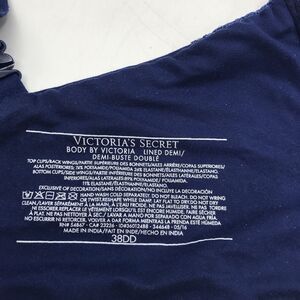 Elevate your lingerie collection with this stunning Victoria's Secret demi bra in a beautiful royal blue color. The bra features underwires and is padded for added support and comfort. The lace fabric type adds a touch of elegance to this classic piece. This bra is designed for women in a size 38DD and is part of the Victoria's Secret Body By Victoria product line. The hook and eye closure and adjustable straps make it easy to wear and adjust to your liking. The breathable material is made of polyamide and elastane, ensuring long-lasting comfort throughout the day.