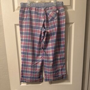Comfy light weight capri pajama pants, can be unbuttoned to extend to full length. Elastic waistband with drawstring.