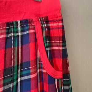 These are pre-owned Victoria's Secret pajama pants, size S/P. The pants feature a red, blue, and green plaid pattern. They have a red elastic waistband with a white drawstring. The material is 53% cotton, 45% modal, and 2% other fiber. There are two side pockets. The hem of the pants has a white trim. There are no visible imperfections.