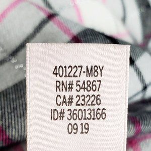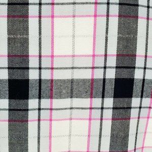 Long sleeves with elastic cuff. Notched collar. Button front. Left chest pocket. Plaid is black, pink, white with a silver metallic threading throughout.