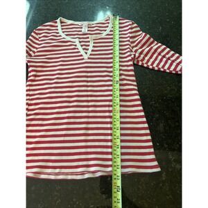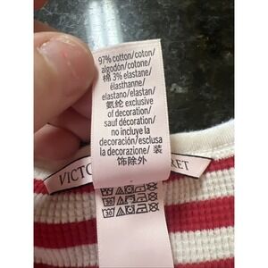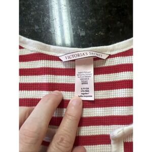 This listing is for a Victoria's Secret pajama set in size small, featuring a red and white stripe pattern. Made from cotton with a stretch material, this thermal tight set is designed for women. The regular size fit ensures a comfortable and cozy sleepwear experience. Perfect for adding a touch of style to your bedtime routine, these pajamas are a must-have for any woman's sleepwear collection.