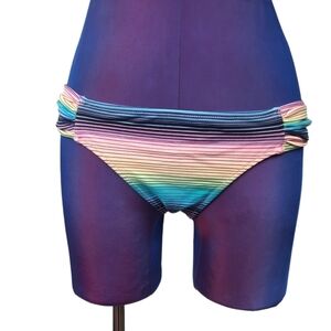Features low rise, ruched sides, regular coverage, pastel striped rainbow colors, veritile.