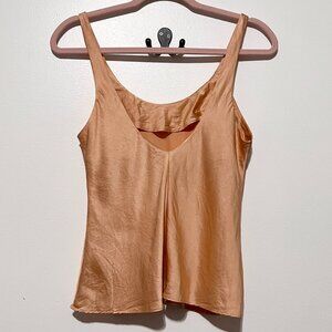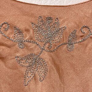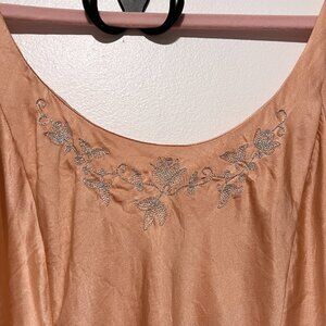 Silky peach tank top. Delicate floral embroidery on neckline. Perfect for layering or wearing alone.