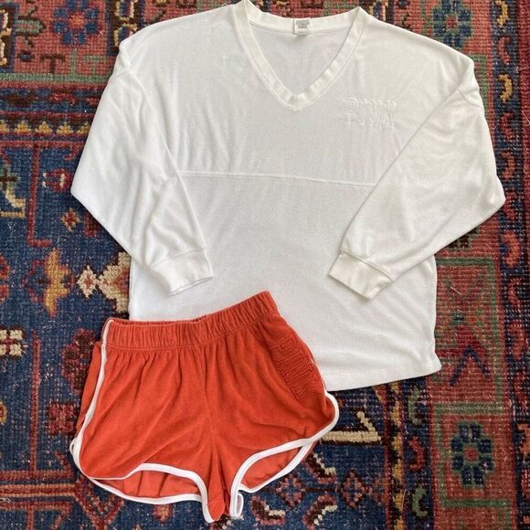 Two-piece Victoria’s Secret pink outfit, including an oversized V-neck Terry cloth pull over with tonal pink embroidered at the chest, and terra-cotta desert hue Terry cloth retro 70s style high waist shorts with white piping and elastic waist.. The shorts also have tonal logo up one hip embroidered. Laying flat the Oversize top measures 27 inches shoulder to ham on the top and 25 inches armpit to armpit. The shorts measure 12 inches straight across the waist relaxed stretching to 16 inches without much resistance. 11.5 inch rise and 2.5 inch inseam. I am not interested in separating the set at this time.