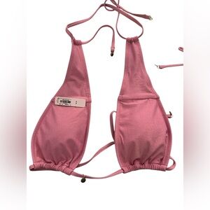 Stylish pink bikini set. Features adjustable ties. Perfect for beach days.