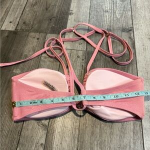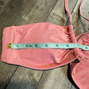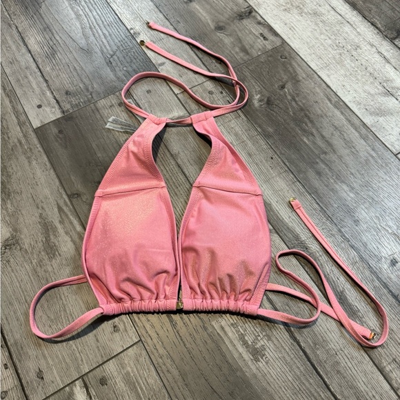 Stylish pink bikini top with halter neck. Features adjustable straps for a perfect fit. Ideal for beach or pool.