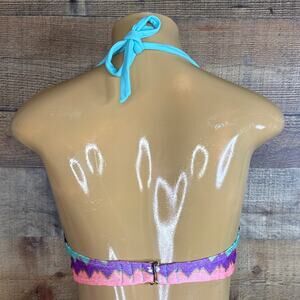 Victoria’s Secret Bikini Top. Size 34 D. Color ~ Pink, blue, purple. Halter tie neck. Padded. Excellent condition. Has a little wear on the material where it clasps in the back. See pics