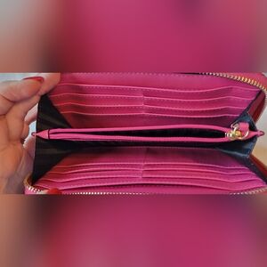 Vibrant pink wallet with chevron pattern. Features heart and 'V' embellishments. Stylish and trendy. Perfect shape.
