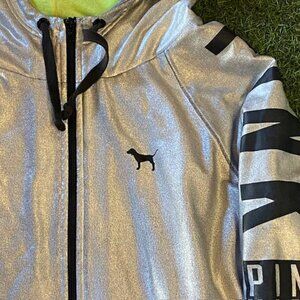 This is a Victoria's Secret Pink Fashion Show Silver Metallic Hoodie Jacket Size Medium. This jacket is in good pre-owned condition.