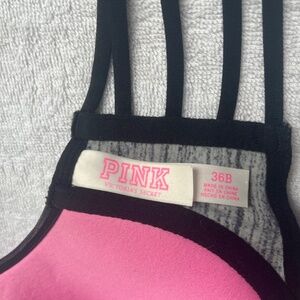 Super cute Victoria’s Secret Pink strappy sports bra, size 36B. It has a front clasp closure, and adjustable shoulder straps. Lightly worn and in great shape.