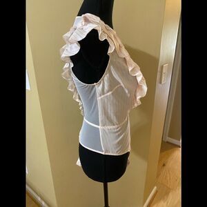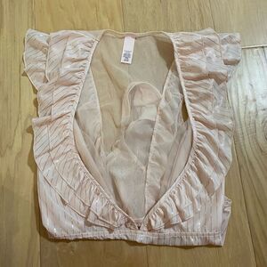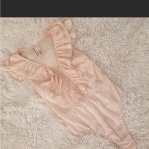 New without tags Victoria's Secret Pink bodysuit in size small. Pink with a thin gold metallic shimmering stripe detail. Deep V-neck front ruffle and a sheer back. High-cut bottom. From a smoke-free home.