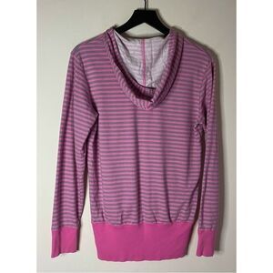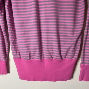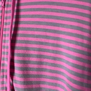 Pink and gray striped full zip hoodie from Victoria’s Secret. Size S. Approximate flat lay measurements- Bust: 19.5” across from armpit to armpit. Length: 27”. Gently preowned condition with no tears or stains.