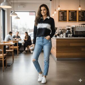 Victorias Secret Pink Nation Long Sleeved Rugby Polo Shirt Womens L Black White