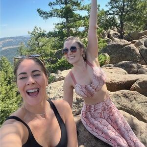 Experience comfort and style with these pink patterned leggings and matching sports bra . Perfect for active days. Both pieces included. Small bottom, large top.