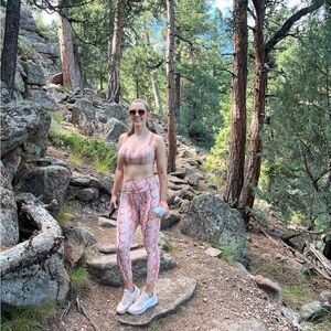 Experience comfort and style with these pink patterned leggings and matching sports bra . Perfect for active days. Both pieces included. Small bottom, large top.
