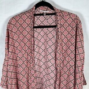 Stylish pink patterned sweater. Open front design. Lightweight and comfortable.