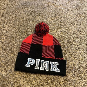 Victoria’s Secret Pink Plaid Beanie with Sequin Bling Cozy Pom Beanie
