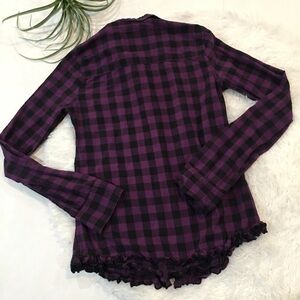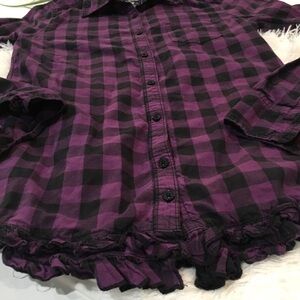 Plaid purple and black long sleeve, button down top with bottom ruffled hem. Size XS. Approximate measurements on photos. Great condition.