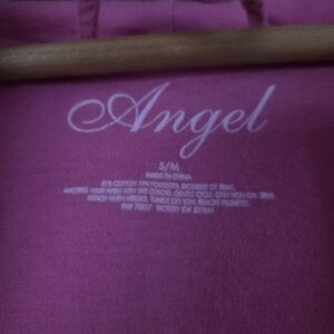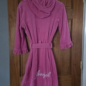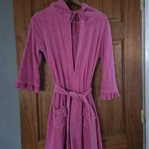 VS pink terry robe with ruffle accents. Ties at the neck, includes a tie belt and two pockets. Size S/M. Sleeves 17", 34" L, 38" W when open. Great condition, no fading or snags.