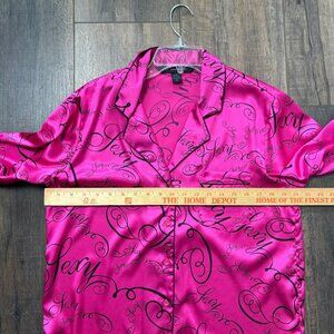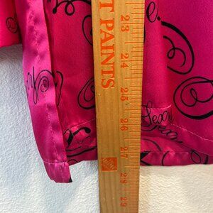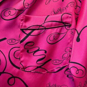 This pajama top exudes a timeless allure, blending luxurious satin material with an elegant black script design. Its vibrant pink hue and classic collar offer a sophisticated yet playful charm, ideal for leisurely evenings or as a vintage collector's piece.