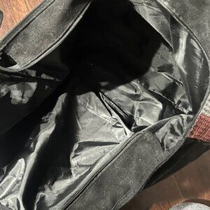 There black back and inside may need a good lint brush cleaning but the bag itself is in good condition with no rips or tears.
