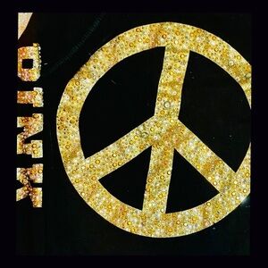 Gold foil bling rhinestone studded dog on chest and a large peace sign on the back in the sand gold foil studded design. It’s absolutely stunning, pictures do no justice. There is a mixture of different size gold and silver crystals.