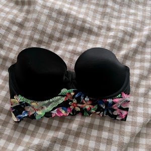 Victoria’s Secret Pink Strapless Bra, black with colorful lace detail, size 34B