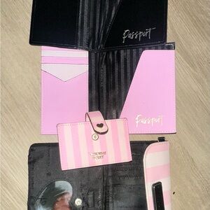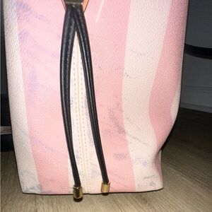 Elegant pink striped travel bags by Victoria's Secret. Includes tote, suitcase, and accessories. Ideal for stylish journeys.