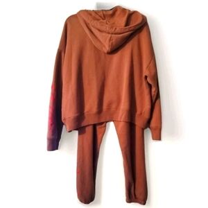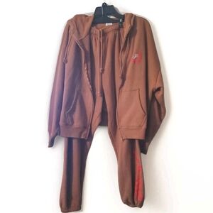 This Victoria's Secret Pink Sweatpants & Jacket set includes a solid coffee colored zip-up jacket and sweatpants made of a cotton blend fabric. Accented with Pink on the right sleeve and leg, logo on front of the jacket. The relaxed fit outfit features a hood, pockets, and is machine washable. It is suitable for activewear occasions like walking, school, beach activities, skateboarding, and running & jogging. Perfect for casual and fitness wear.