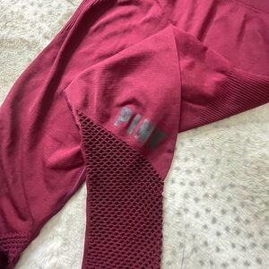Stylish purple leggings with mesh details. Ideal for gym or casual outings. Comfortable and stretchy.