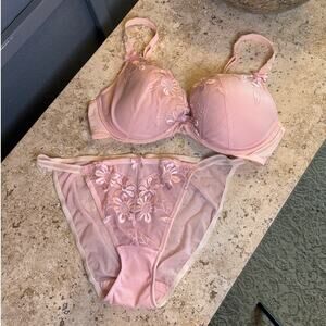 Victoria's Secret Pink Vintage Floral Embroidered 36D Bra LG Bikini Panty Set