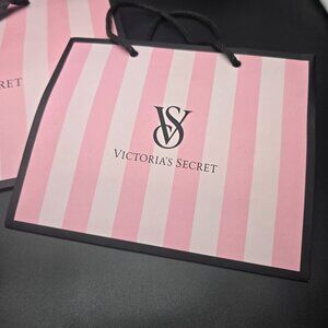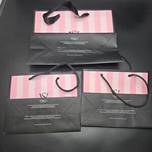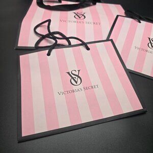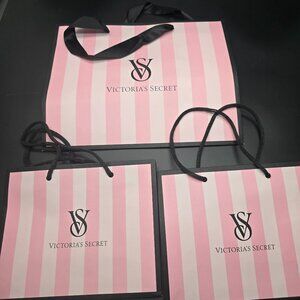 A stylish set of three Victoria's Secret shopping bags featuring pink and white stripes, durable black handles, and an elegant branded logo design.