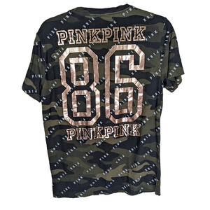 Victorias Secret Pink XS Graphic Tee Camo Top Loose Fit Rose Gold Metalic Back