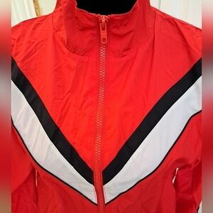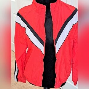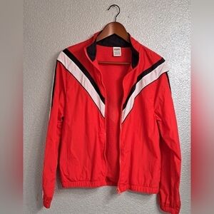 pre owned excellent condition, red windbreaker with a black & white chevron pattern, elastic cuffs & waistline, full zip up with a mock neck, Pink logo on the back & sleeves, 100% polyester, pit to pit 18.5" sleeve 24" length 23" 0176
