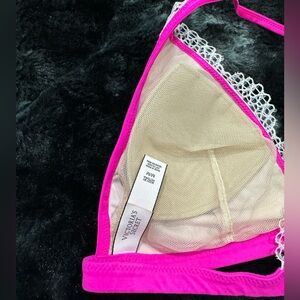 A very cute Victorias Secret Bralette Set. Bralette is lace like an ombré pink with front opening for easier put on or take off. Size medium and has adjustable straps. Thong is from PINK very cute lace details around and cotton in between. Pink logo on the back is size medium. Both used once and washed very carefully.