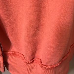 Super cute peach/coral color. Purchased from Victoria's Secret Pink store. Not brand new but in fairly good condition. Light weight. It is missing the string tie on the hood. Small stain on the inside. There are a few pieces of thread that are loose but can but snipped off.