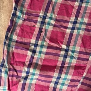 Vibrant plaid design with pink and blue hues. Perfect for casual wear. Comfortable fit. Has small little black dots/ stains not noticeable