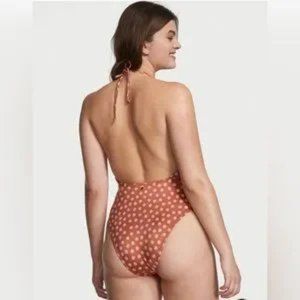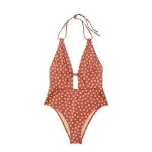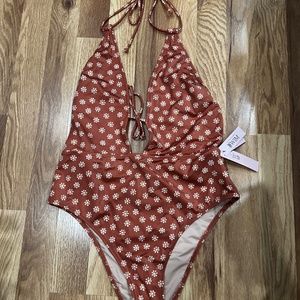 A sexy plunging neckline is perfectly balanced with a daisy print and tie-front detail. NWT and hygienic liner