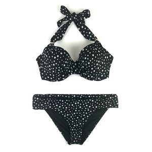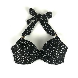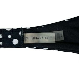 Great condition Victoria’s Secret brand bikini. Women’s size 36 C top. Size medium bottoms. Nylon/Lycra spandex. Stretchy. The Forever Sexy collection. The Unforgettable Demi top shown with fold over bottom. Black polka dot print. Ruching out front. Light molded padding. Underwire. Gold tone hardware at straps. Halter ties at neck. Clasp back closure. In a word, unforgettable. Feminine rushing in glimmering gold tone hardware make this push-app Demi top glam on the sand. From our forever, sexy swim collection of-app, tops and bottoms in sun, loving colors & prints. Also have a variety of VS swim suits for sale. Feel free to leave a comment or bundle! Thanks for browsing!