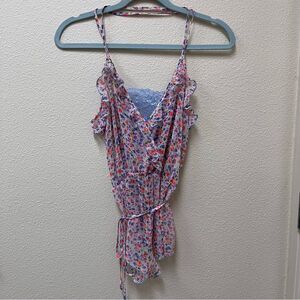 Bright, floral, and sheer! Loose fitting romper/teddy/bodysuit with ruffles and lace accents, waist is stretchy to hug you just right and straps are adjustable. Also fairly certain and it photographed on the model backwards but maybe that just means there's 2 ways to wear it? Could be super cute worn at a festival!