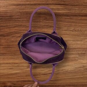 Unveiling a delightful piece of Y2K nostalgia: a Victoria's Secret mini bag that captures the essence of early 2000s charm. This petite handbag features a rich purple velvet exterior, adorned with a shimmering gold heart design that adds a touch of playful elegance. The bag is equipped with sturdy, matching purple handles, perfect for carrying by hand. A smooth, gold-toned zipper secures the contents, while a charming heart-shaped zipper pull adds an extra detail. Inside, the bag is lined with a coordinating purple fabric, complete with the iconic Victoria's Secret label, marking its place in fashion history.