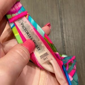 Vibrant bikini set with tropical leaf pattern. Features bright pink, green, and blue colors.